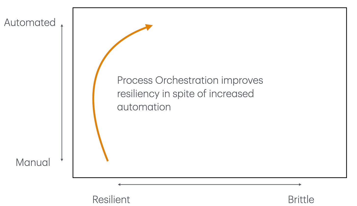 Trust me, the Robotic Process Automation (RPA) world is 100% built on this tradeoff. It attempts to automate that which couldn’t previously be automated - the human interactions with software that aren’t backed by clean APIs. Many previous generations of software failed to automate this work in a way that was acceptable to the business. And the approach did resolve some of the most basic brittleness issues at the beginning of the curve - in other words, it pushed the line of “where is it reasonable to stop automating” quite a bit further.