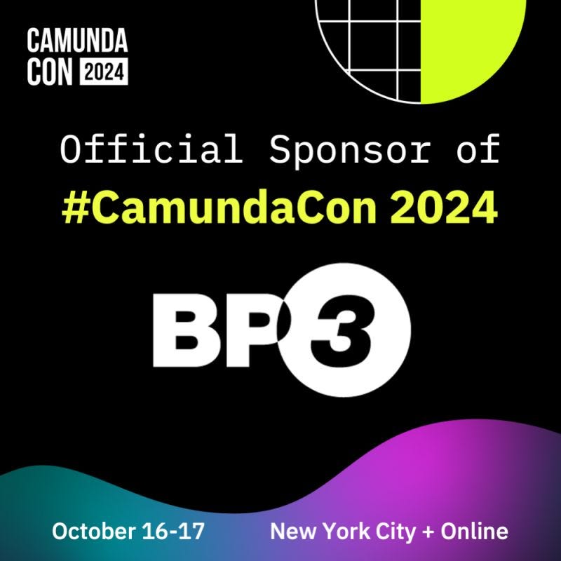 This coming week I’ll be joining BP3 at CamundaCon in New York City. This is the second time Camunda has hosted this event in the USA. I encourage anyone reading this to register for CamundaCon either in person or on the livestream - it’s a great way to learn about process orchestration and how it can be the framework for creating value in your organization.